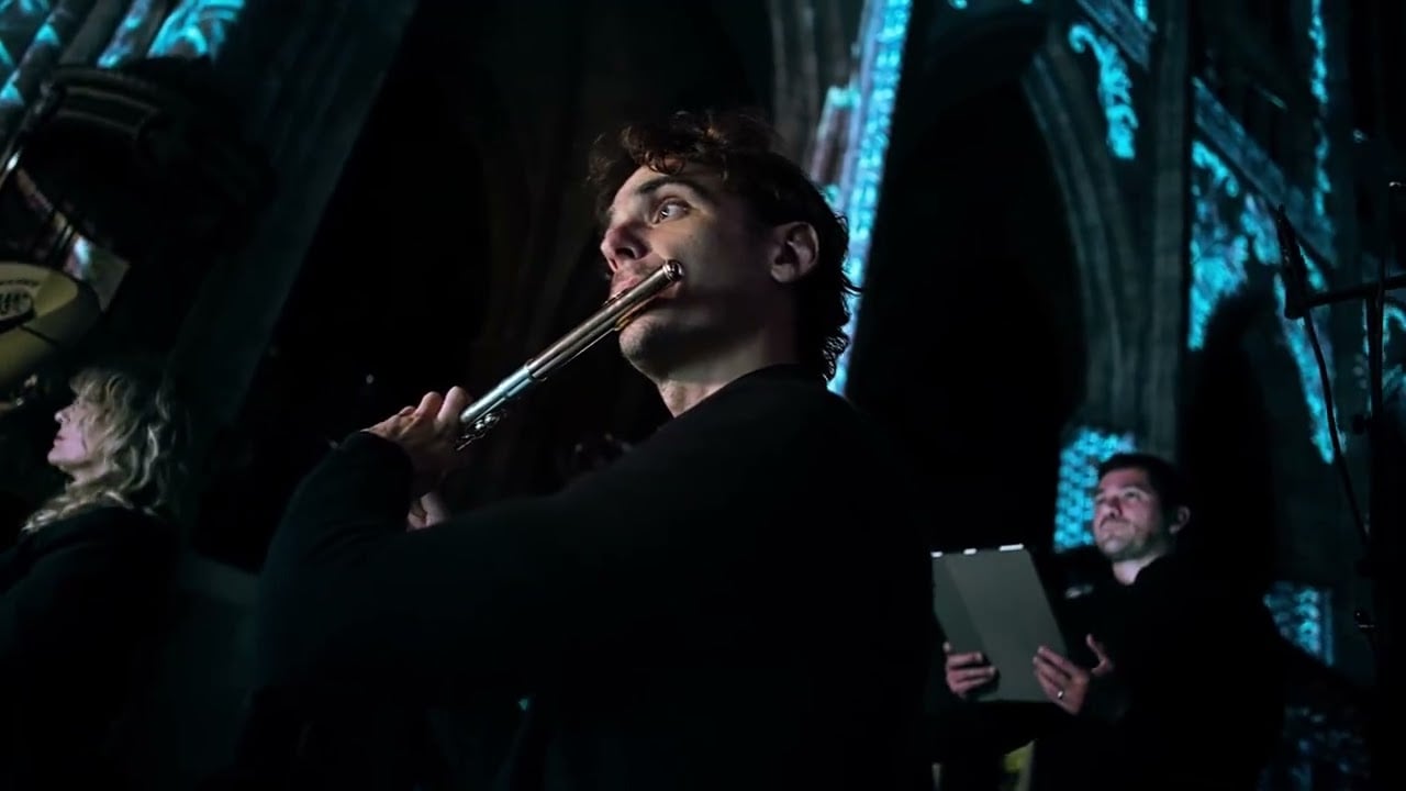 Le spectacle est précédé d'une première partie : avant de prendre place, le public est invité à déambuler librement dans la nef, tandis que la voix et la musique de solistes en live accompagnent cette exploration. Vous pourrez notamment retrouver Grégoire Blanc qui excelle au thérémine, ajoutant des sonorités éthérées qui enrichissent les textures auditives.